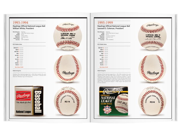 History of the Baseball’s Official National & American League Base Ball Guides are the first and most comprehensive collector’s guides for identifying, dating, and pricing Spalding, Reach, and Rawlings Official National & American League Baseballs. These guides identify every baseball used in professional National & American League baseball games from 1876 to 1999. Each page in these guides showcases a ball in remarkable, high-quality professional photography, showing all stamped panels, as well as the original box. These changes are accurately traced chronologically and go through the National & American League of Professional Base Ball Clubs. Each page is dedicated to a specific ball and time period, and highlights even the smallest of changes, including the Presidential stamping, logo changes, stitch type and count, materials, and branding differences. Some of these baseballs are so rare that only one or two are known to exist, and this guide contains photographs of even those most rare of baseballs.